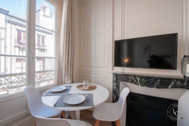 Un salon cosy , TV écran plat, espace repas et grandes fenêtres offrant une belle luminosité sur rue piétonne.