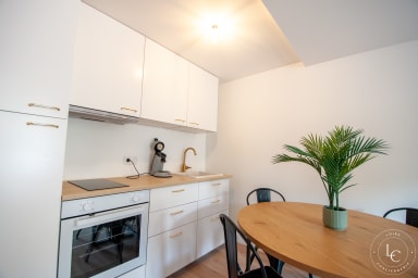 Cuisine entièrement équipée (four, plaques, réfrigérateur, machine à café…)