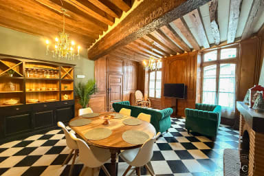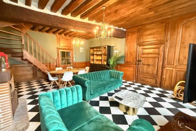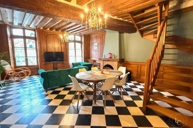 Entièrement restauré dans un esprit chaleureux, le logement mêle boiseries anciennes, poutres apparentes, sols en damier, et mobilier confortable pour un séjour authentique en vallée de la Loire.