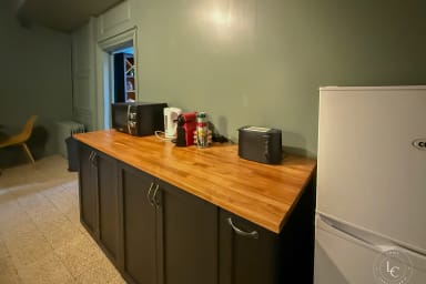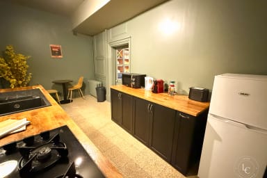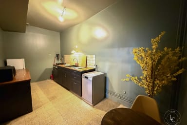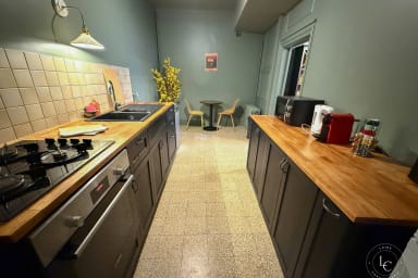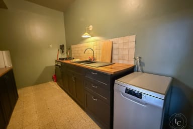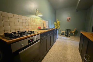 - Une cuisine fonctionnelle (four, plaques, frigo, lave-vaisselle, vaisselle…) avec ambiance authentique