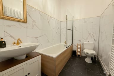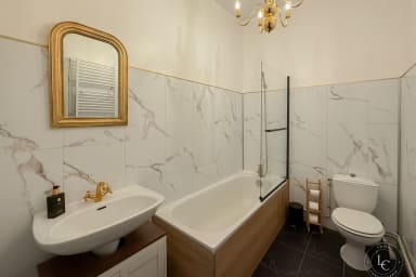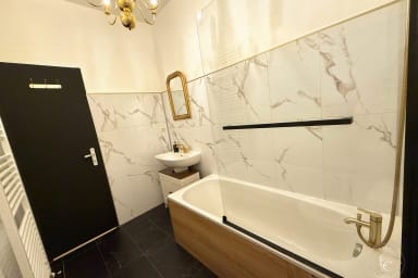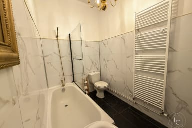 - Une salle de bain élégante, avec baignoire, douche, WC et sèche-serviettes