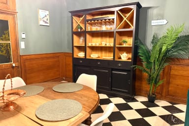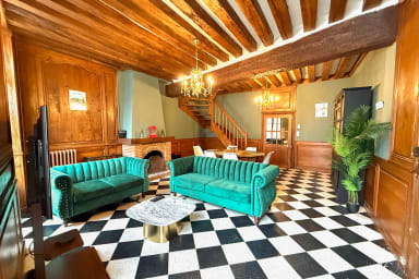 - Un vaste salon-salle à manger avec cheminées décoratives, deux canapés en velours, TV, et une grande table pour partager vos repas